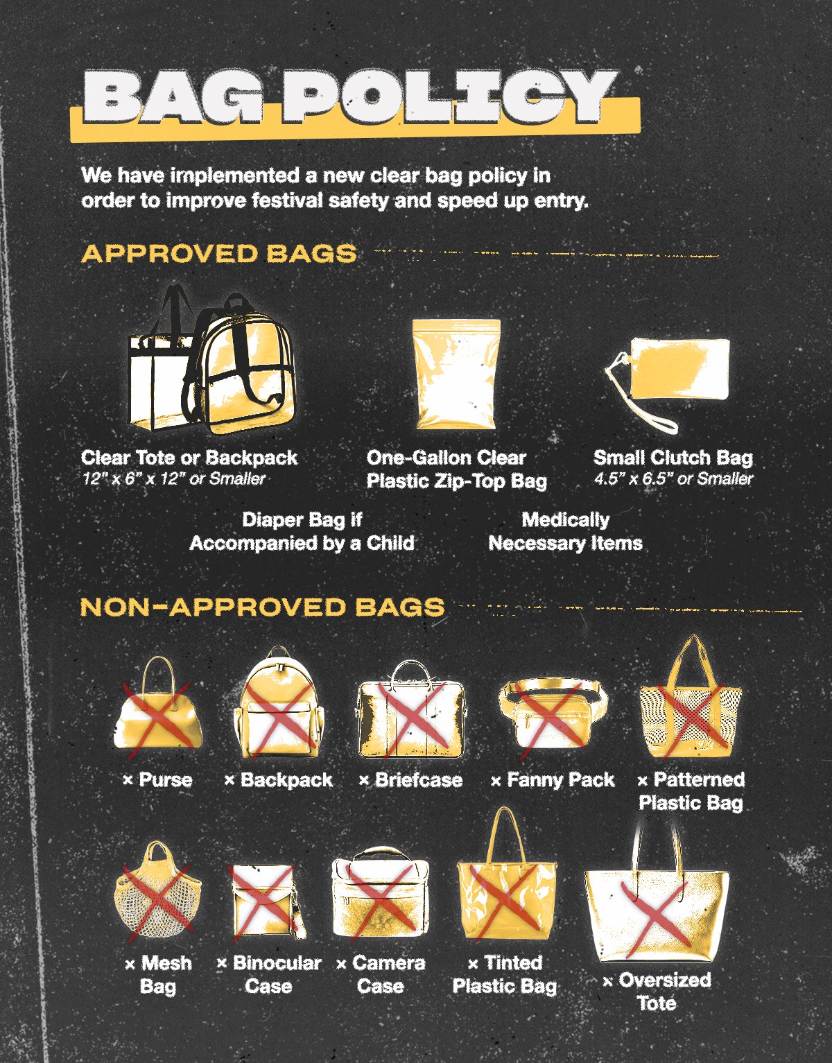 In addition to the list below, any item deemed inappropriate by festival personnel will not be allowed into the venue/festival and must be either returned to your vehicle or disposed (as appropriate).